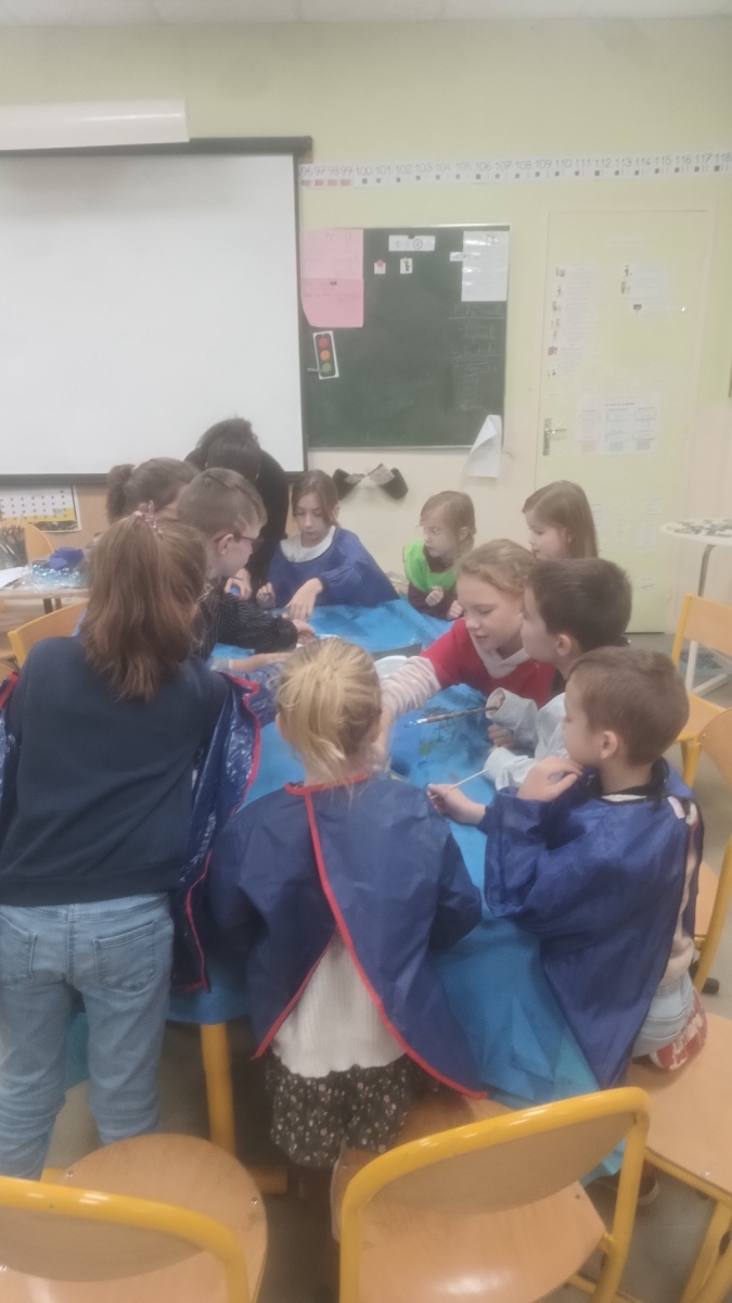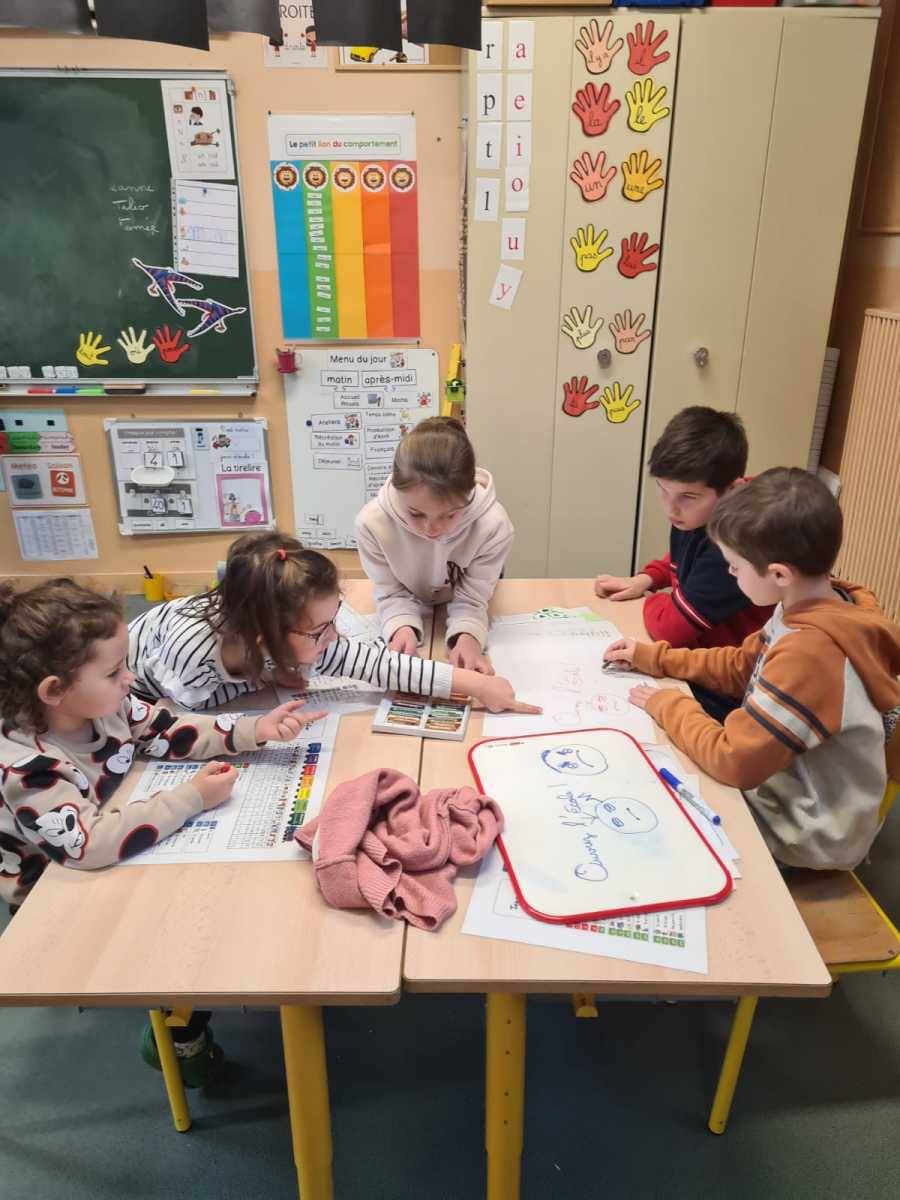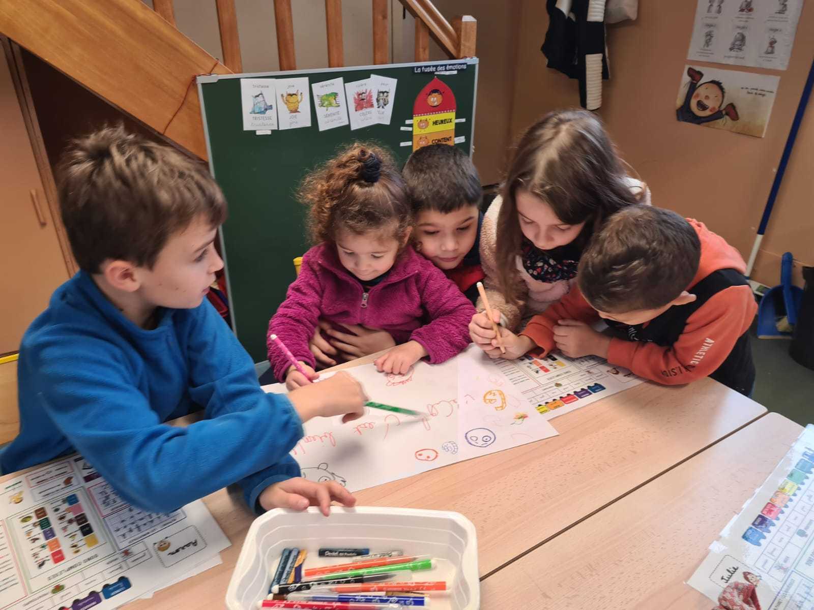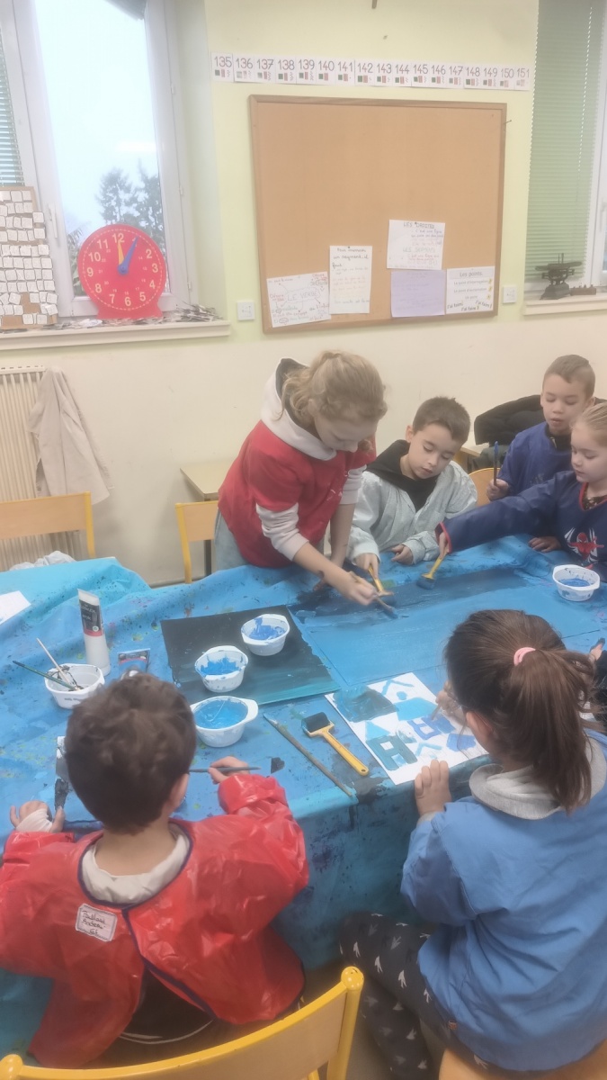 – La tristesse : Avec Héloïse et Emilie, les élèves ont pu mettre en avant leur fibre artistique pour représenter le monde de la tristesse. Cette idée s’inspire de l’album Le magicien des couleurs.