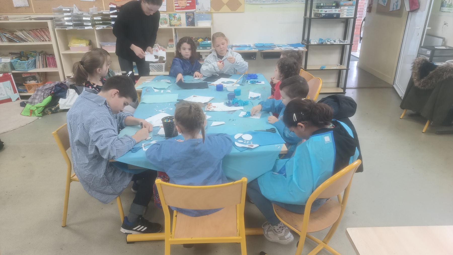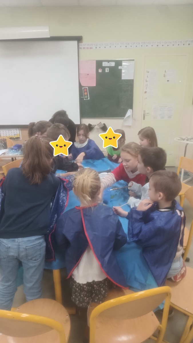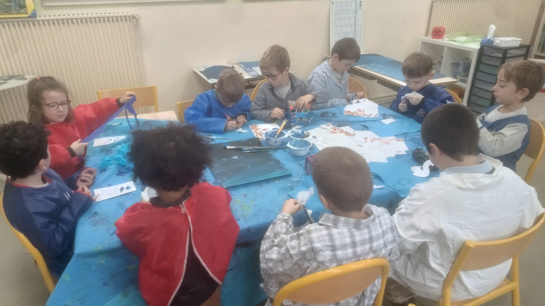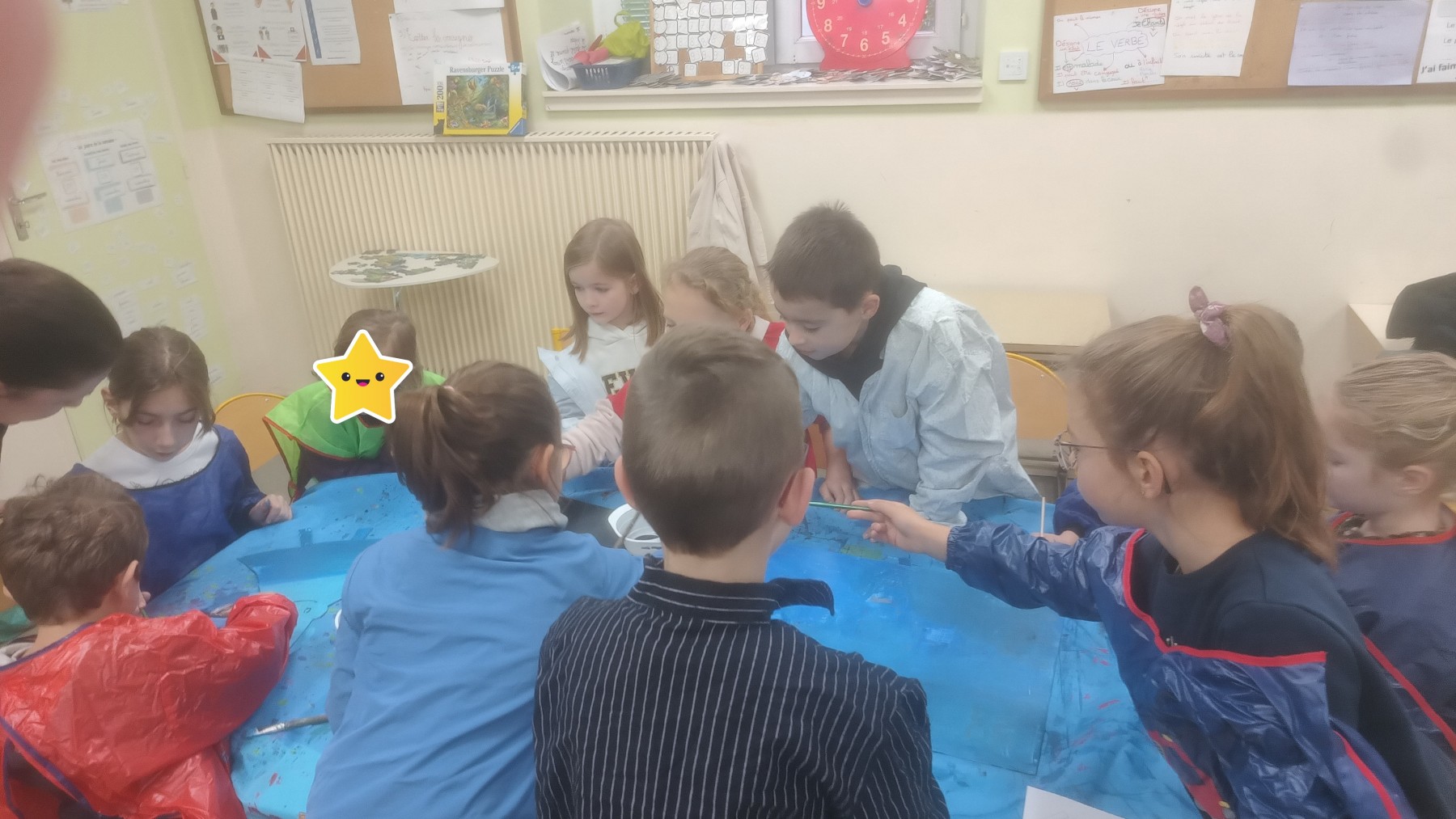 – La tristesse : Avec Héloïse et Emilie, les élèves ont pu mettre en avant leur fibre artistique pour représenter le monde de la tristesse. Cette idée s’inspire de l’album Le magicien des couleurs.