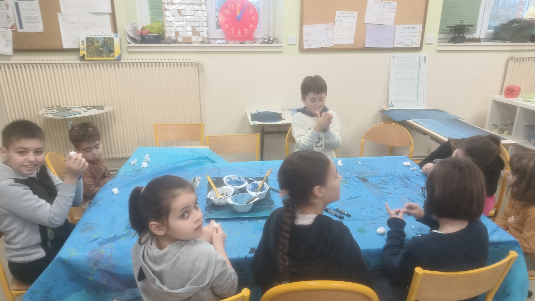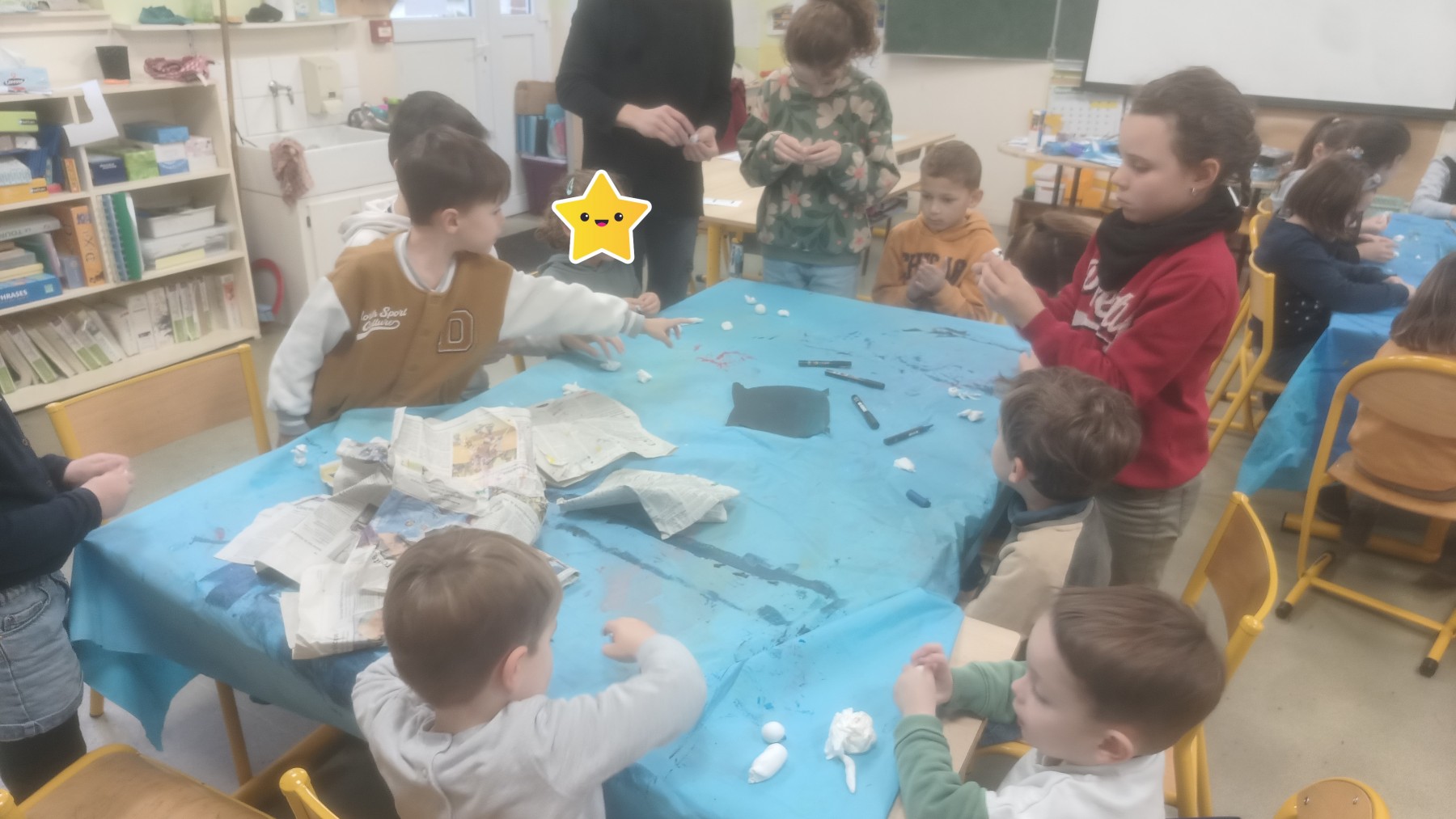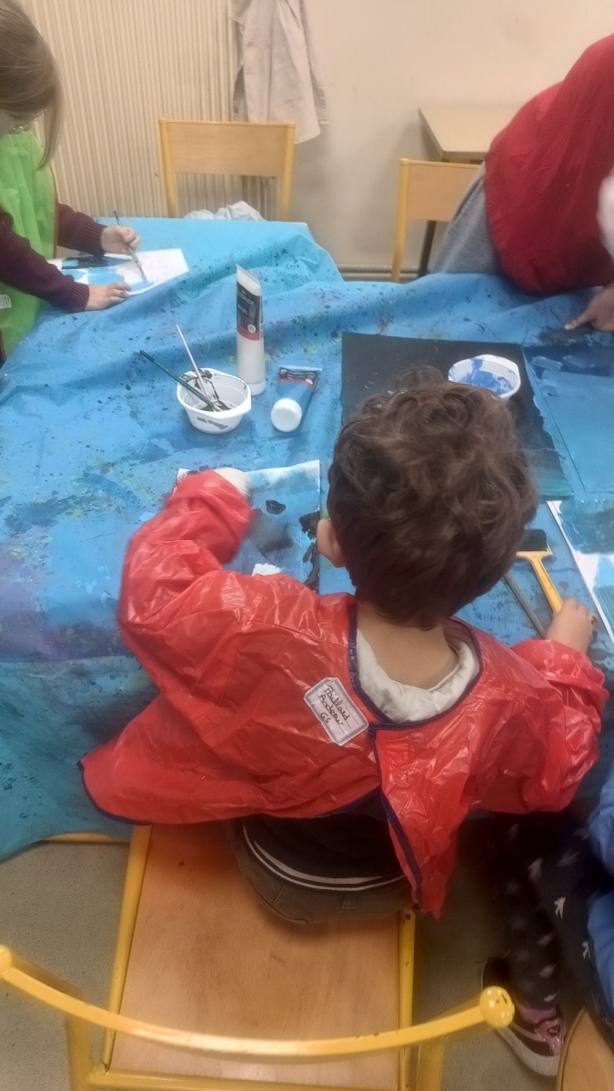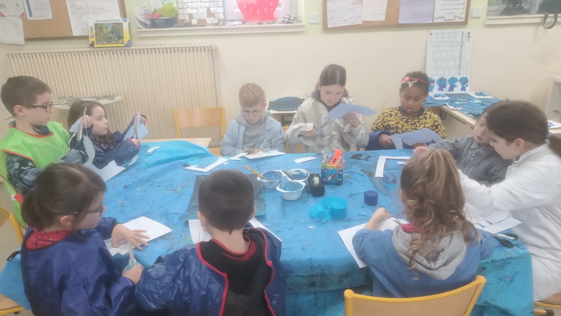 – La tristesse : Avec Héloïse et Emilie, les élèves ont pu mettre en avant leur fibre artistique pour représenter le monde de la tristesse. Cette idée s’inspire de l’album Le magicien des couleurs.