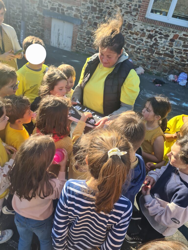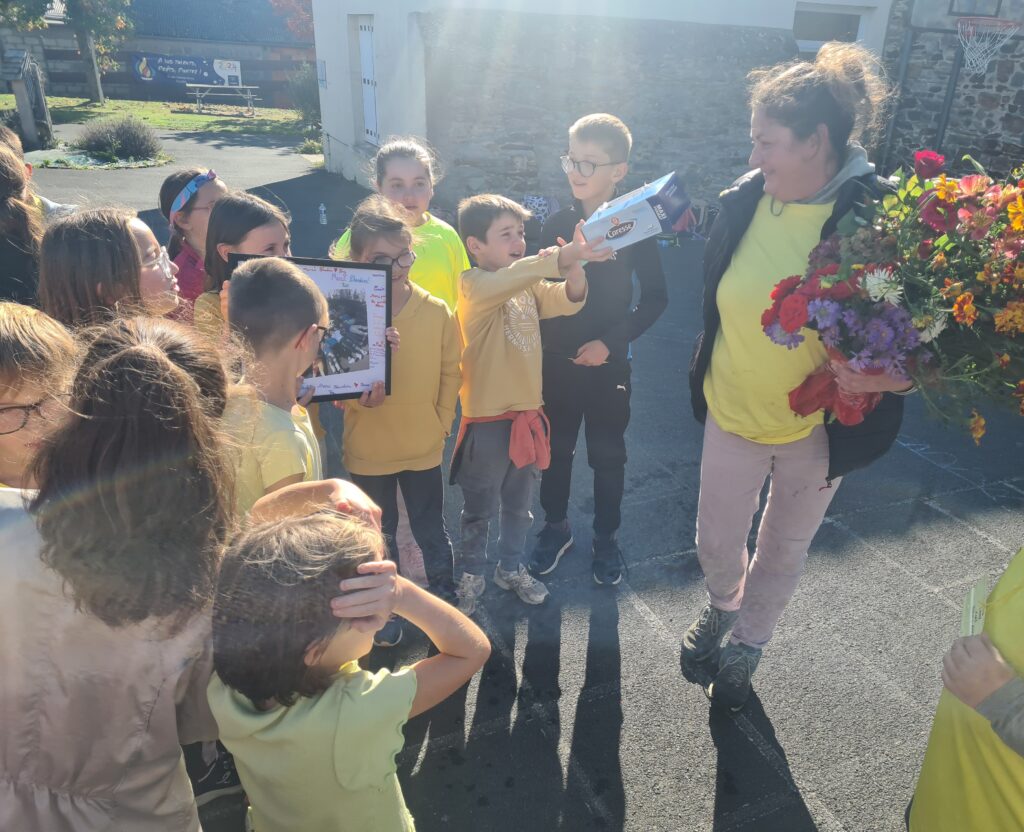 Lors de sa dernière journée, mardi 14 octobre, toute l’école lui a fait une haie d’honneur. Elle a reçu de nombreux cadeaux et des bouquets de fleurs faits avec les fleurs que chacun avait apportées. Ce fût un moment de fête, en musique, rempli d’émotions. Blandine part vers de nouveaux horizons.